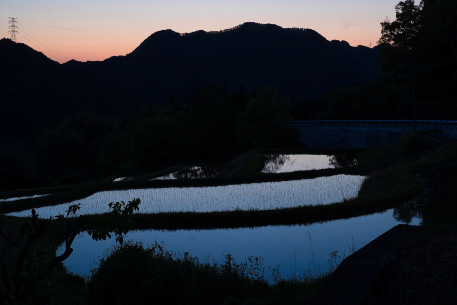 薄暮に染まる棚田の情景