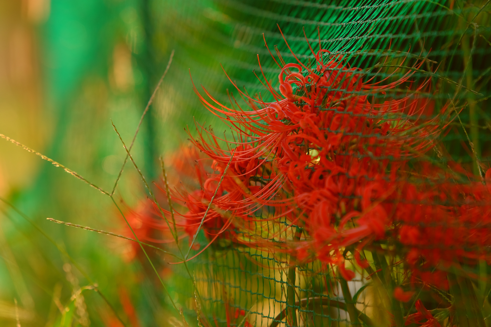 緑色の養生ネットに囚われた彼岸花の風景。二週間ほど前に別のカットをエントリーしたのですが、囚われた感が出ていなかったという理由でもう一枚。ネットの隙間からしべを出して逃げ出そうとする姿が痛々しいと思う反面、その姿には溢れんばかりの生命力を感じられて思わず勇気づけられたりするのでした。