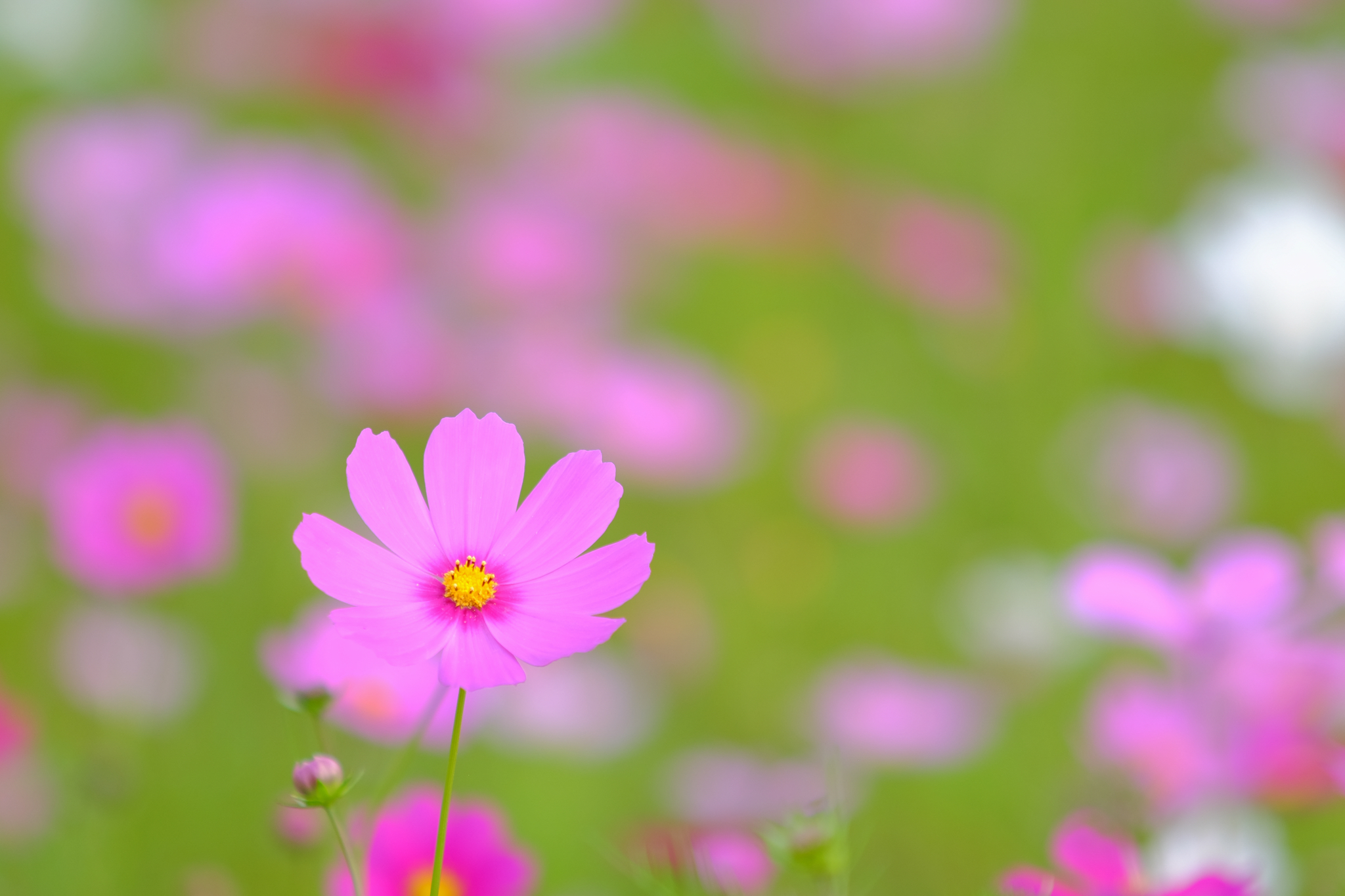 郊外のコスモス畑は予想以上に肌寒くて、秋になったばかりのはずなのにすぐにでも冬がやってきそうなそんな雰囲気。こんな寒さの中、わざわざコスモス畑に立ち寄るなんて余程の物好きでもないと・・・と思っていたのですが、なにがどうして結構な盛況ぶりで、そのまま通り過ぎる車のほうが少ないほど。そんなささやかな賑わいの中、望遠ズーム越しに見つめ合う秋桜のピンクは上着いらずの暖かさ。そして、隣から聞こえてくるおばあちゃんとお孫さんの仲睦まじい会話はそれ以上の温かさで。