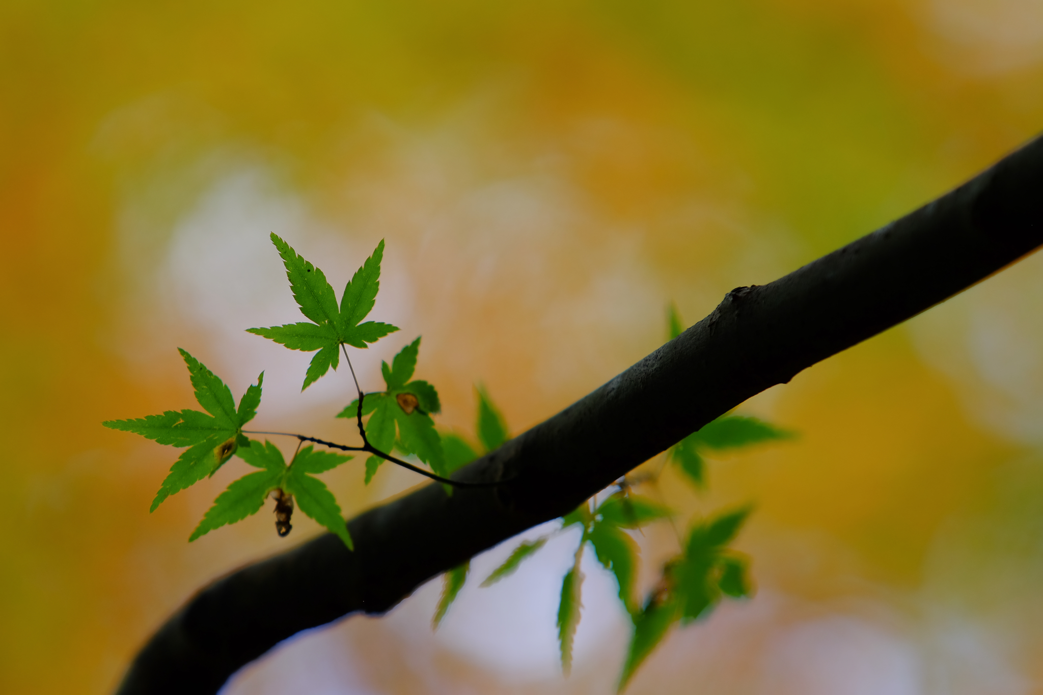 閑散の滑川渓谷。平日だし紅葉にはまだ早いしで訪れる人も疎ら。ただ、この渓谷はそんな静寂がよく似合っていて、降り積もる落ち葉の音が聞こえるような雰囲気が格別なのです。そして実際、足元に敷き詰められた色鮮やかな落葉の絨毯の風景は一見の価値があると断言できるのですが、今シーズンは果たしてその風景に巡り会えることができるのでしょうか。と、そんなことを考えながら狙うのは、まだ色づかないつもりの青紅葉。やわらかな木漏れ日と色づき始めたばかりの紅葉の色彩を背景に構図を作るのですが、その印象はやはり「静けさ」だったりするのでしょうか。