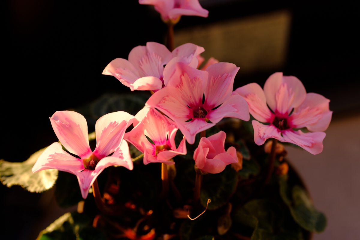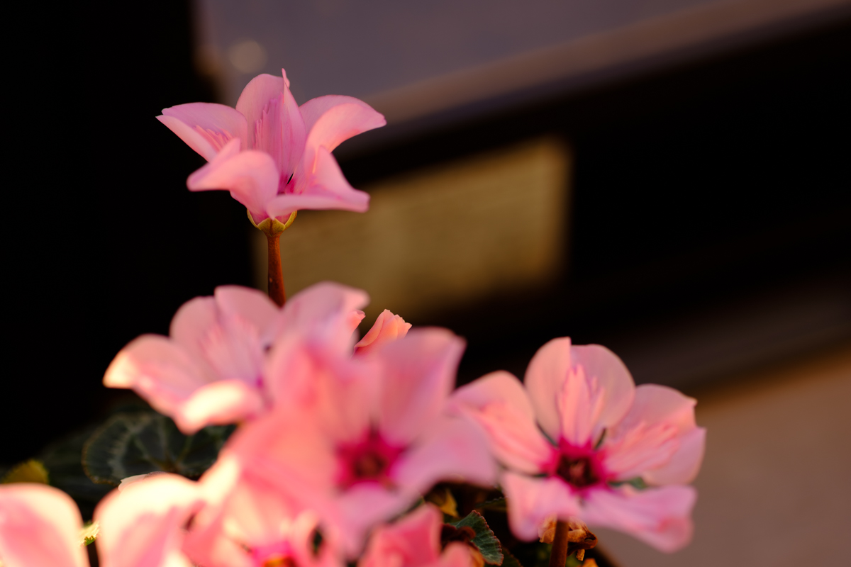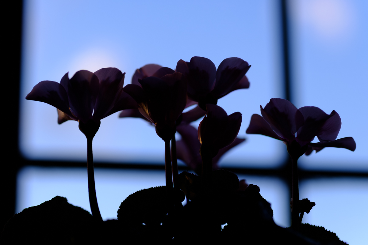 夕方、もう少しでカエルさんが帰ってくるというタイミングで焼ける空。出窓のカーテンを開けて少しだけの撮影会は70ミリのマクロレンズとX-H1で。あまり見ない品種のシクラメンが夕照に映えて、スマホのリフレクションは出窓を開けたくないがための苦肉の策で。