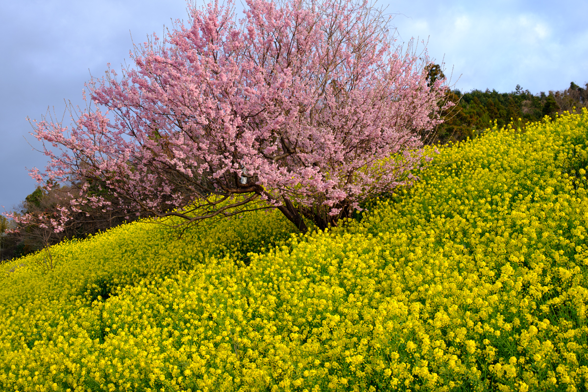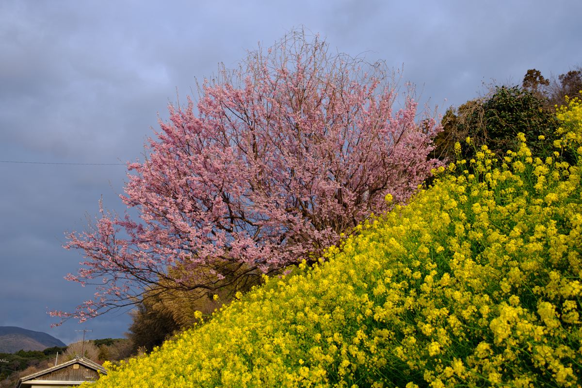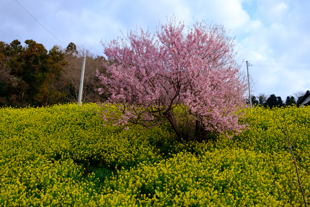 ちょっと喉が渇いたので自販機でホットコーヒーでも。そう思ったときに必ず寄る場所があるのですが、その場所のすぐ奥にこんな風景が・・・あったっけ? まあ、人の記憶なんてものはすごく曖昧だということですよね。それにしても、河津桜が満開だと菜の花でさえ脇役に見えてしまいます。電線と電柱が絶妙にフレームインする場所に存在していて望遠ズームが最適解ではないかとも思ったのですが、今回は広角ズームで説明的に。
