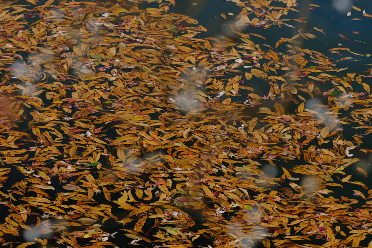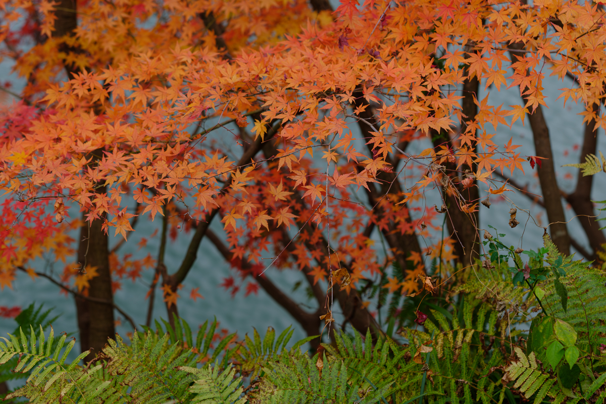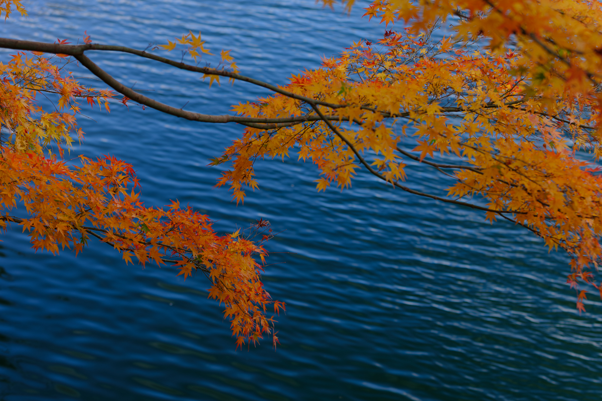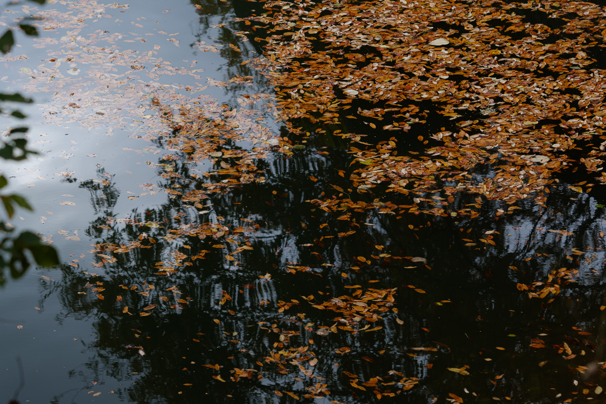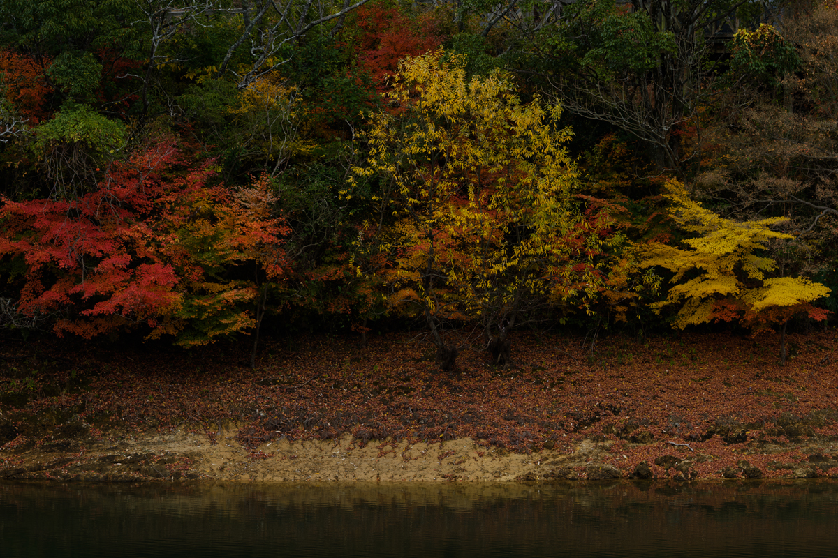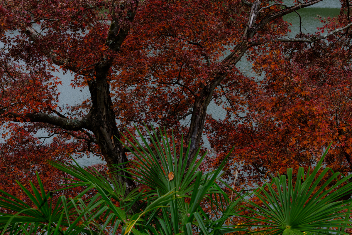 撮影は続きます。池の周りを彩る色とりどりの紅葉とさまざまな表情の水の色。途中、時地人(じじじん)というリゾートホテルの前を通りかかったのですが、この辺りの紅葉が特に秀逸。実はこの辺の撮影だけで半分以上の時間を費やしたような気がします。そういえば、撮影中に背後から聞こえる賑やかな声(日本語に混じって英語も少し)に振り返ると結婚式の前撮りの一団が迫ってきていてハッとしたのですが、この彩りの中だといい写真が撮れたのでしょうね。