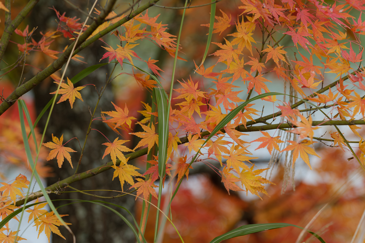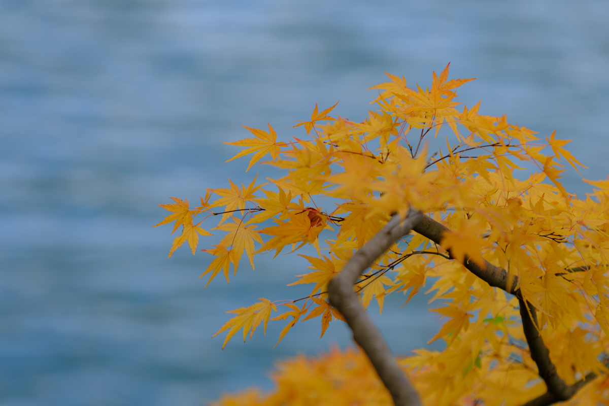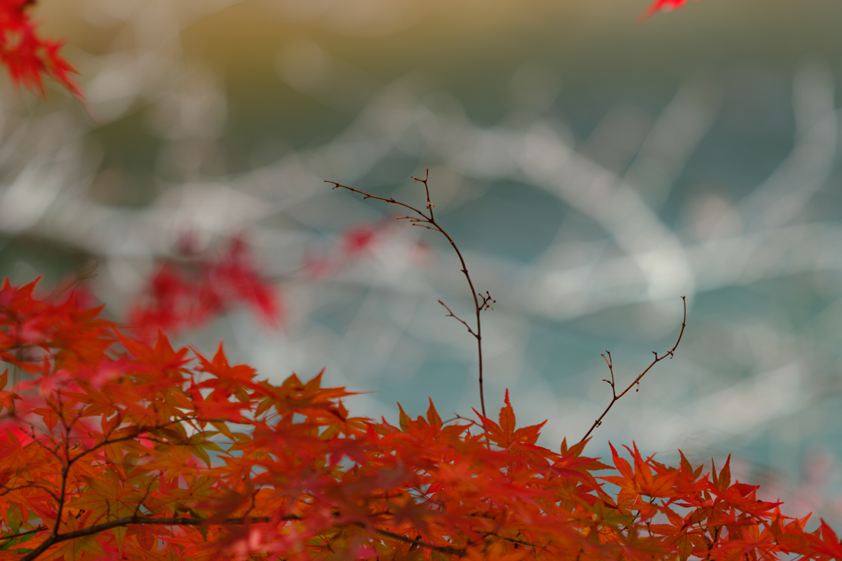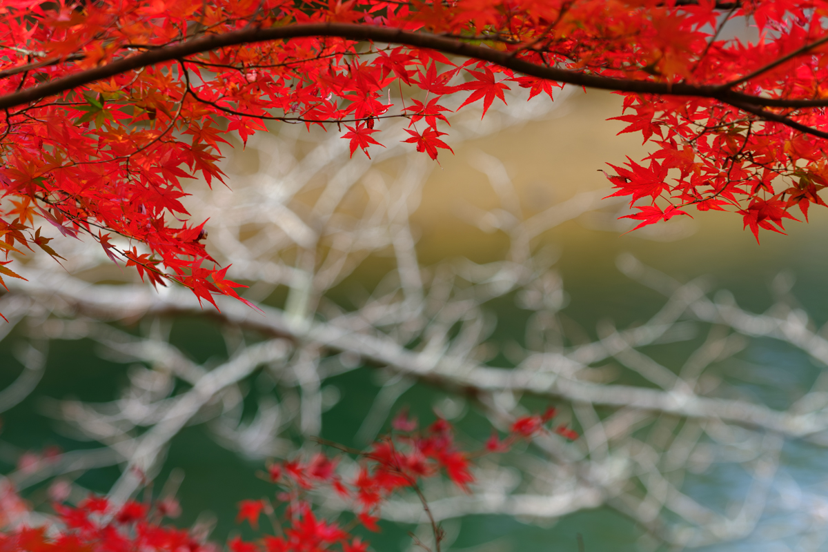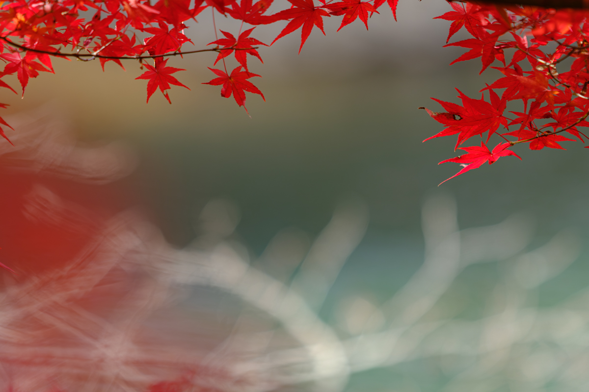 撮影は続きます。池の周りを彩る色とりどりの紅葉とさまざまな表情の水の色。途中、時地人(じじじん)というリゾートホテルの前を通りかかったのですが、この辺りの紅葉が特に秀逸。実はこの辺の撮影だけで半分以上の時間を費やしたような気がします。そういえば、撮影中に背後から聞こえる賑やかな声(日本語に混じって英語も少し)に振り返ると結婚式の前撮りの一団が迫ってきていてハッとしたのですが、この彩りの中だといい写真が撮れたのでしょうね。