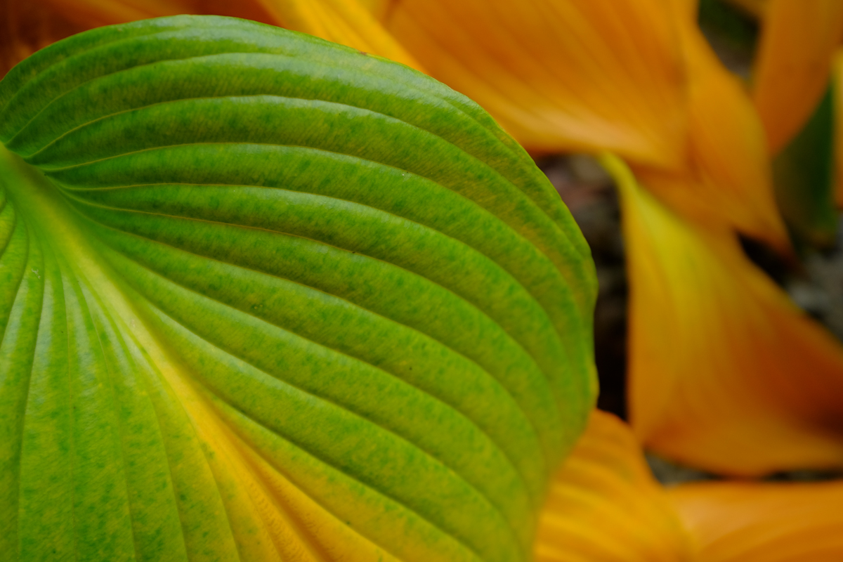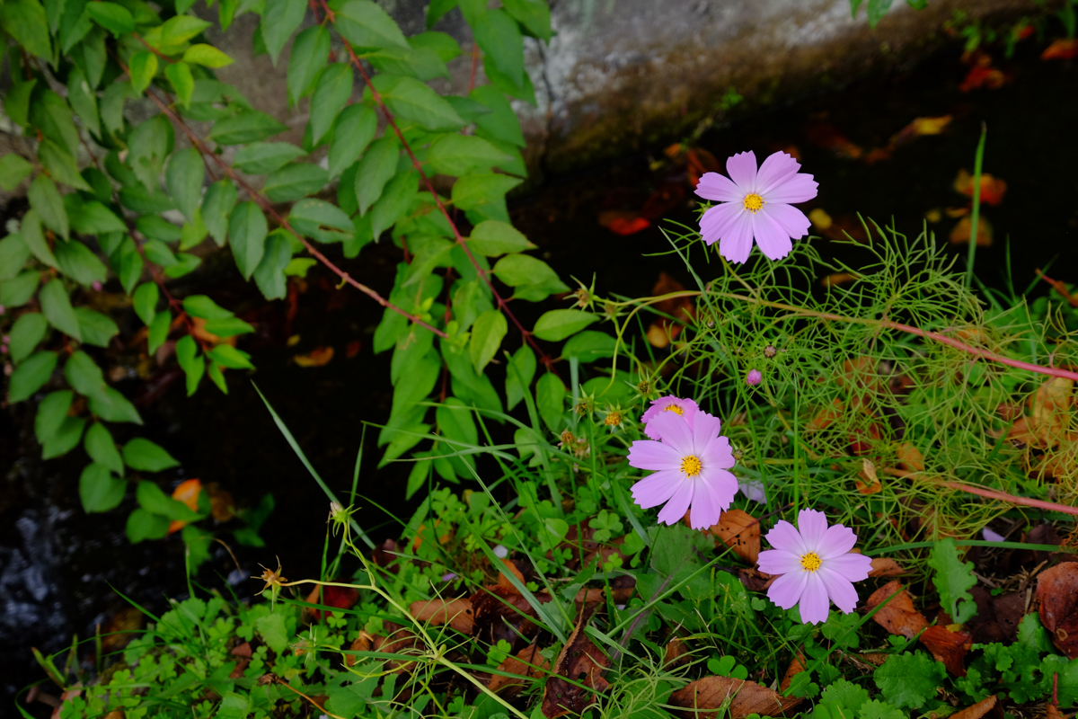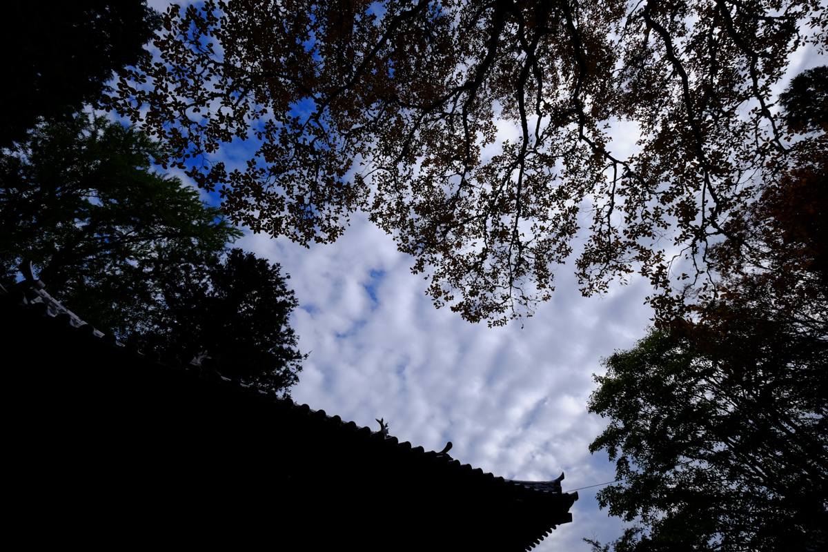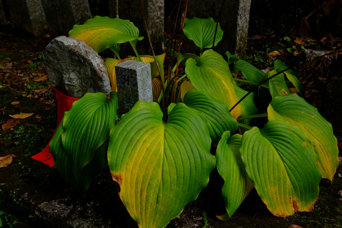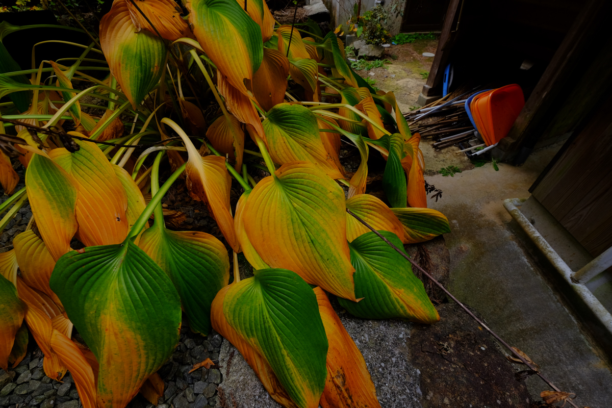惣河内神社へと続く橋を渡ったところにあるお気に入りのカエデはすでに散ってしまっていて、鐘撞堂に寄り添う湾曲のカエデの樹は色づく前。けれど、今日の主役は擬宝珠(ギボウシ)の秋色でした。色づき始めたばかりのその風情は季節の移ろいを感じさせて、その色彩は絶妙のコントラスト。黄色く染まり切ったそれよりもむしろ。