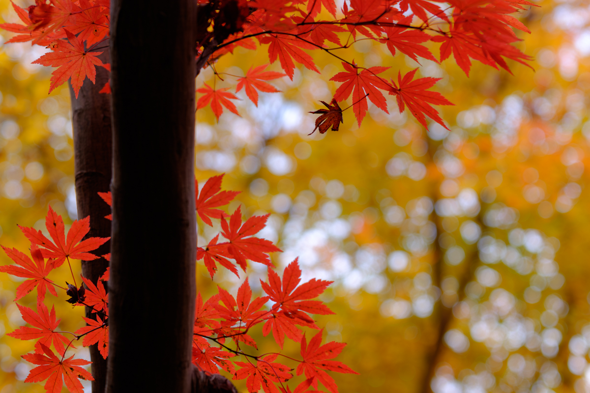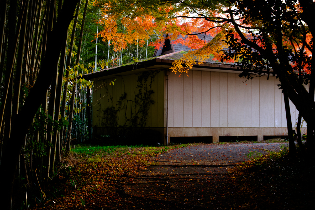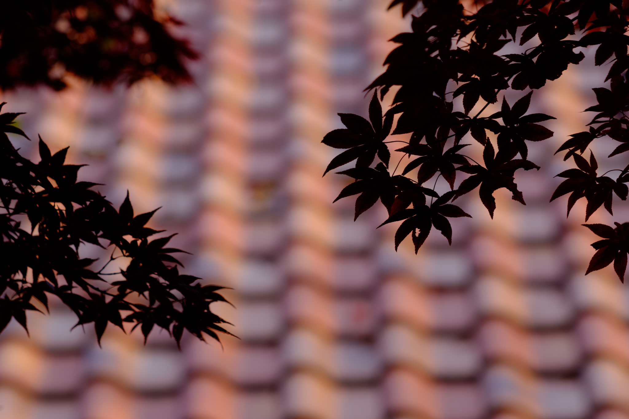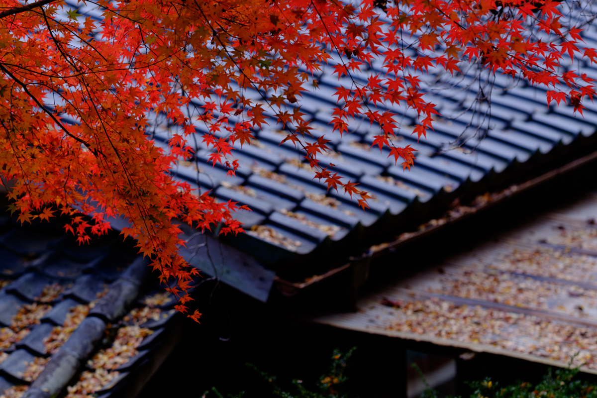 赤系もみじにいぶし瓦の風景。このコントラストだけでご飯三杯はいけそうです。先の薄ピンクの屋根瓦とこのいぶし瓦の風景は紅葉のトンネルから脇に逸れた小径にあったのですが、この風景は来年ももう一度撮りたいと強く思わせる面白さだったのです。