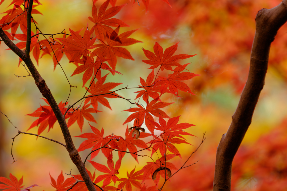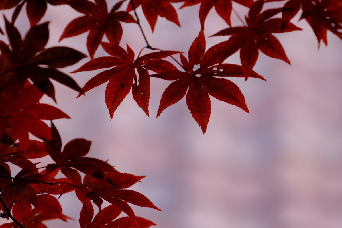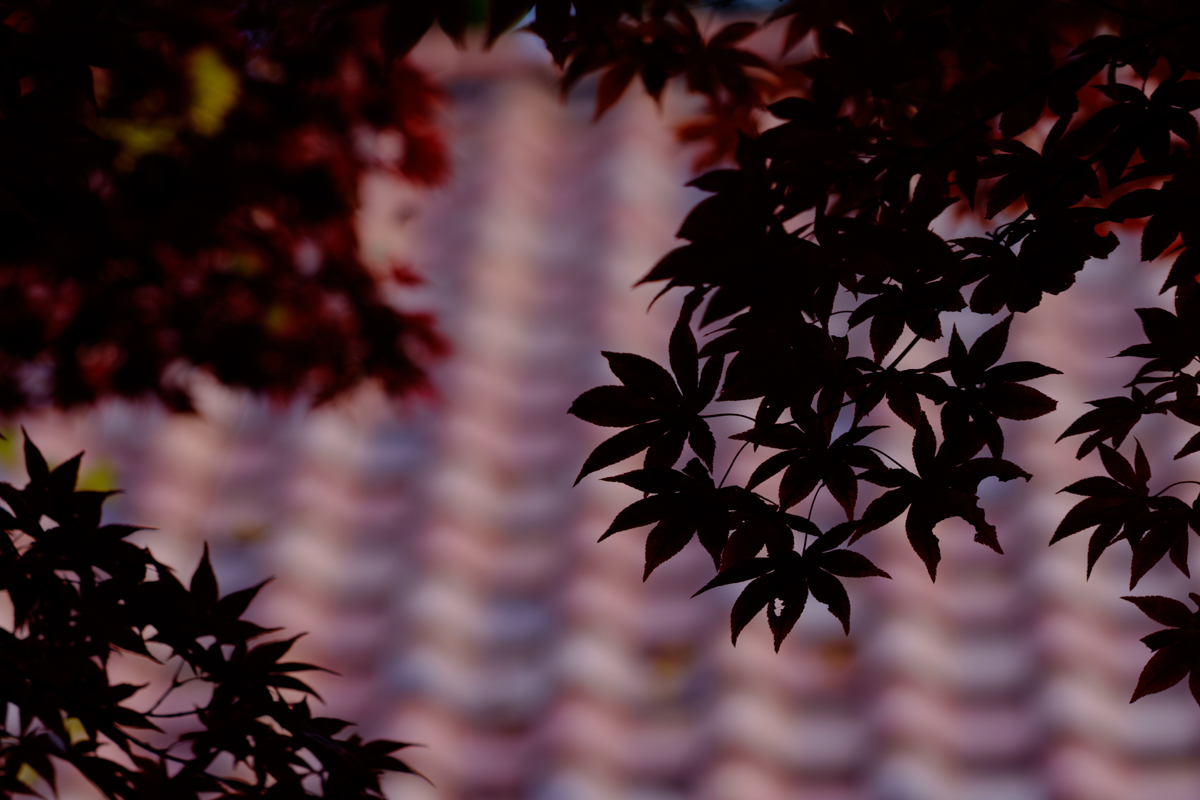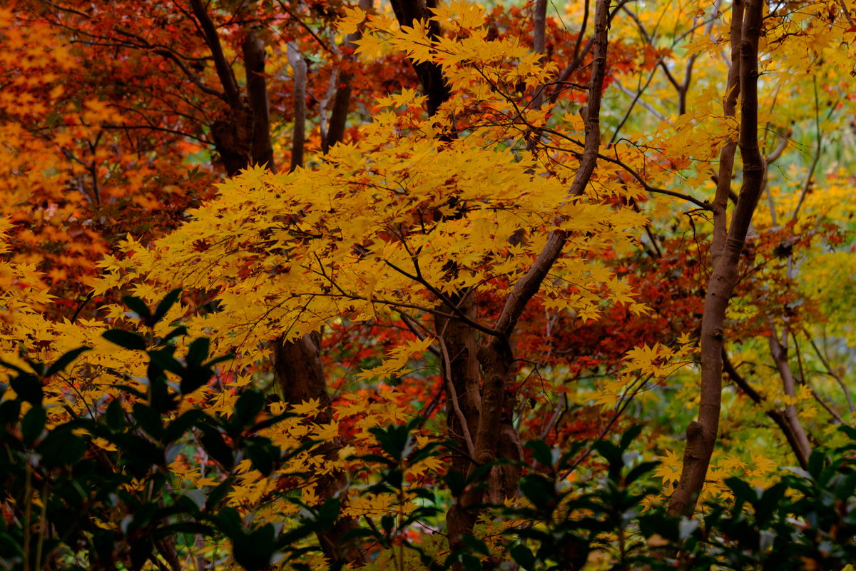 赤系もみじにいぶし瓦の風景。このコントラストだけでご飯三杯はいけそうです。先の薄ピンクの屋根瓦とこのいぶし瓦の風景は紅葉のトンネルから脇に逸れた小径にあったのですが、この風景は来年ももう一度撮りたいと強く思わせる面白さだったのです。