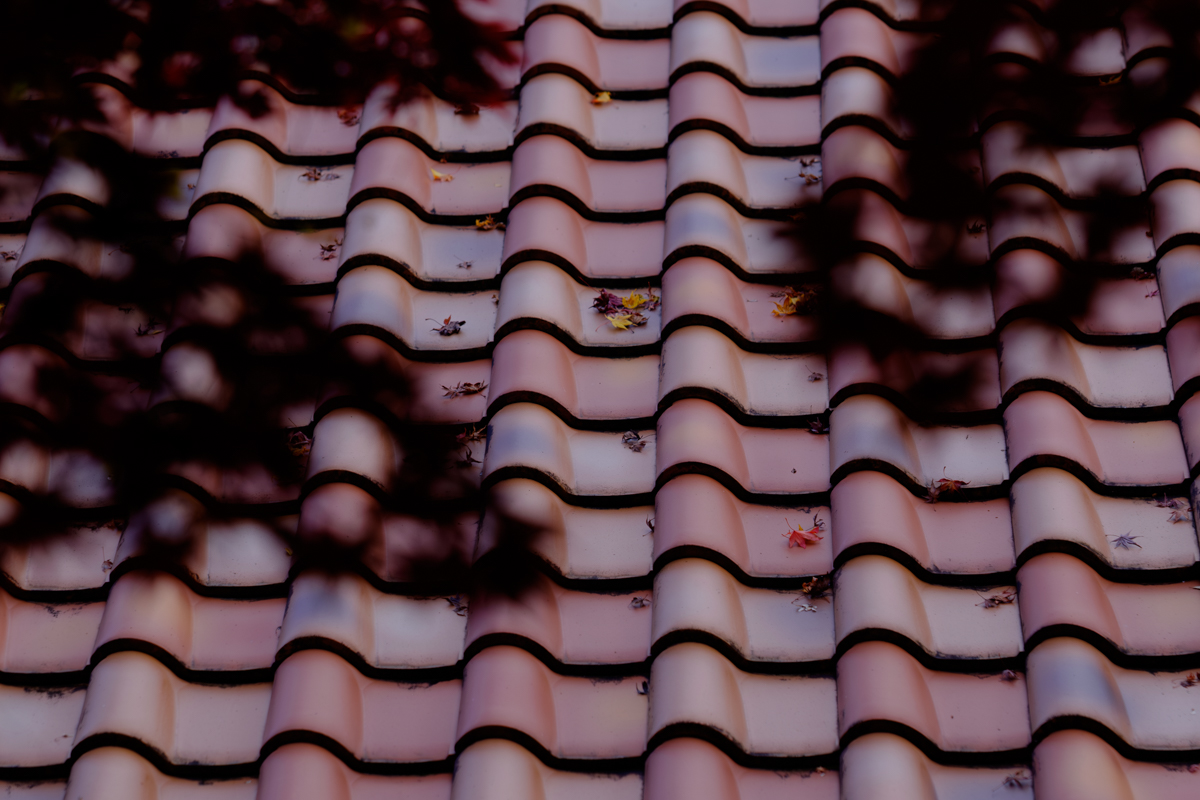 さて、紅葉のトンネル。なるほど、光が射してくればさぞ美しいことでしょう。けれど、この人だかりではどうやっても人が写りこんでしまいます。バイクやクルマをトンネルの入り口に停車して撮影している方もいましたが、ワタシには少し敷居の高いロケーションのようです。と思っていたところに目に入った風景は、薄いピンクの屋根瓦に紅葉が絡む個性的な風景。このモチーフ、個人的にはかなりツボでした。